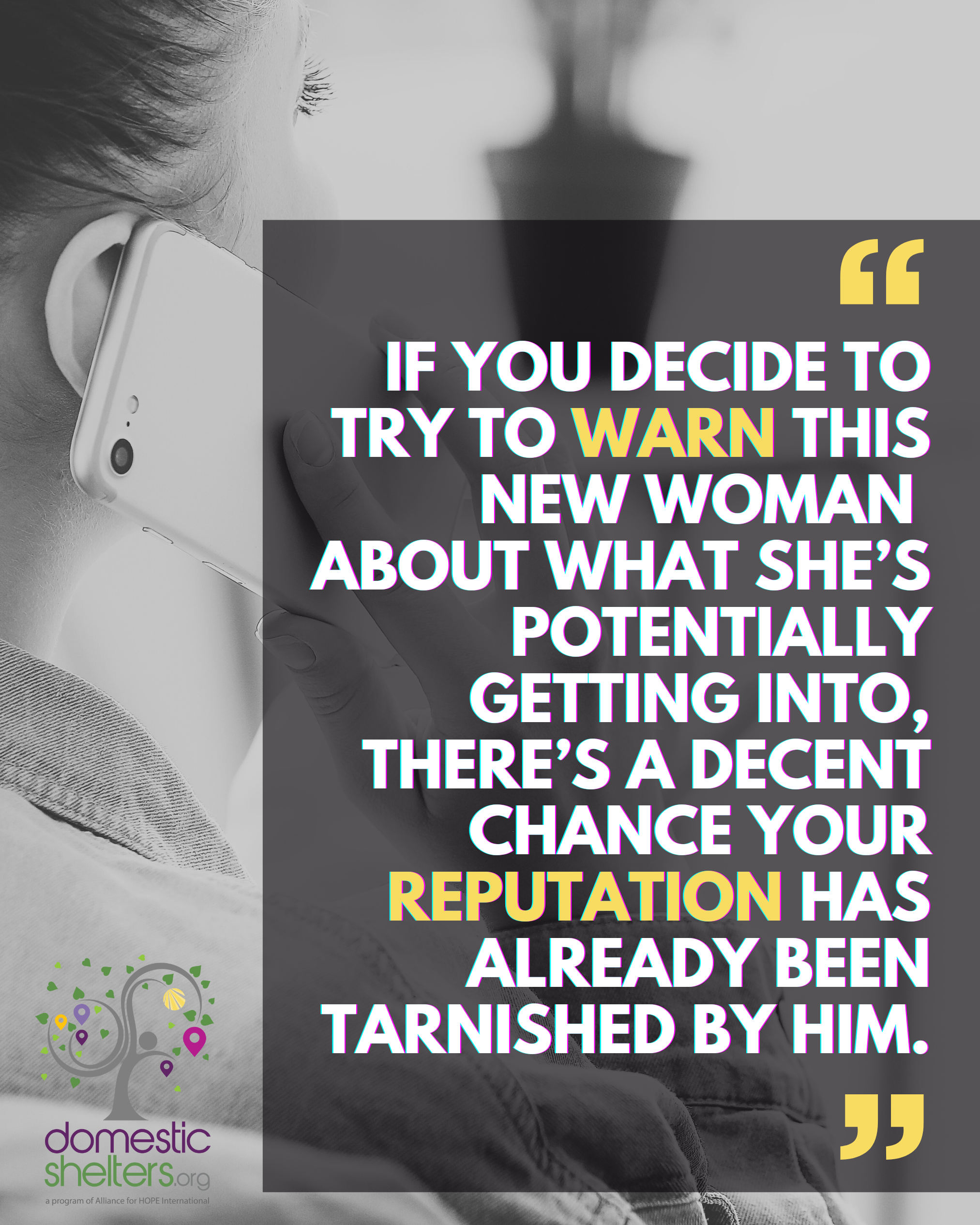 Ultimately, you should listen to your gut when it comes to what decision will keep you and your children safe. But it’s admirable and brave for you to want to warn this new woman as well. In my opinion, we women need to look out for each other when it comes to abusive men rather than work against each other. That’s why it’s so important to believe women, first and foremost. Here’s hoping both of you stay safe going forward.