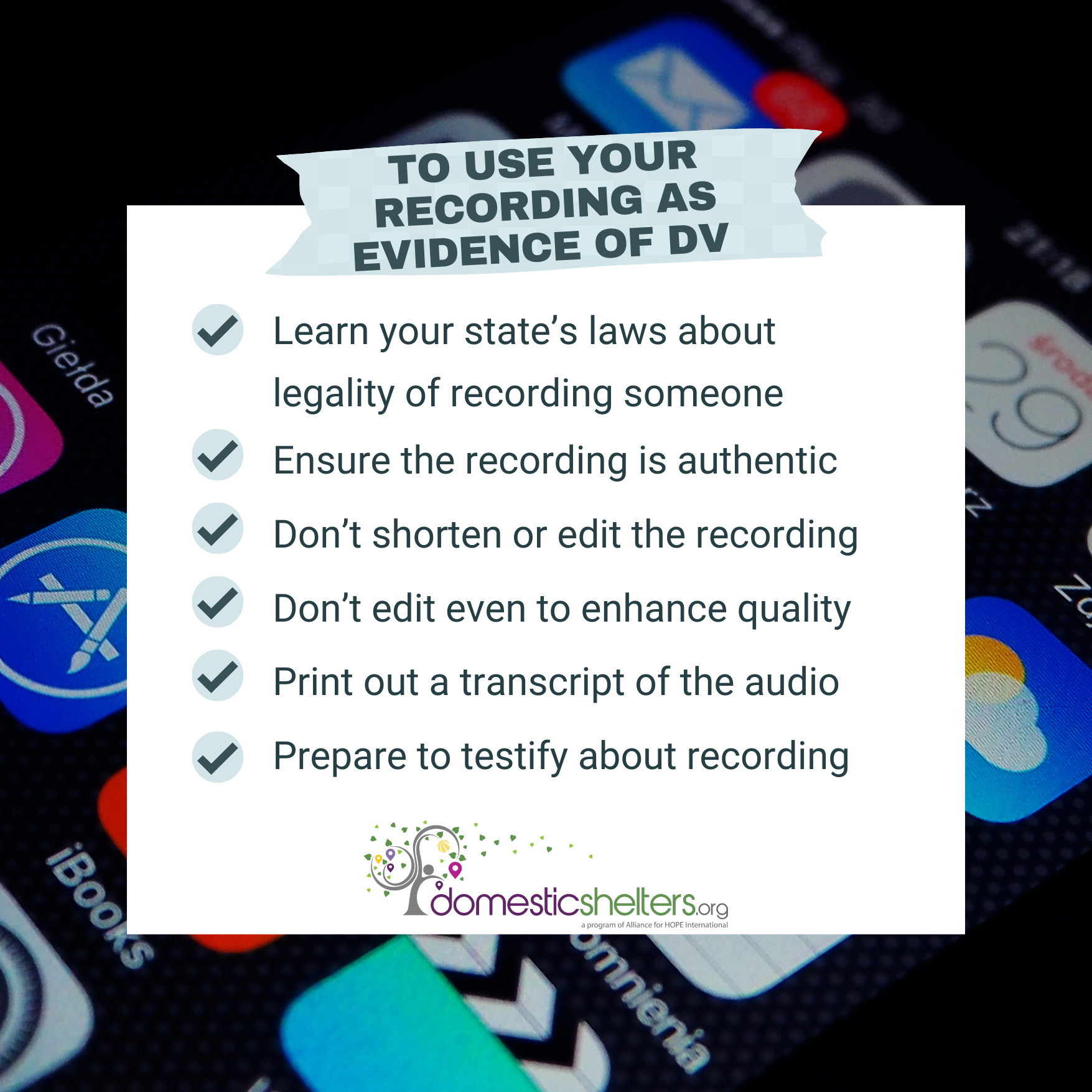 If possible, secure other types of evidence in addition to or lieu of a recording, which can help to bolster your case if you choose to file for an order of protection or file charges for abuse. For a list of evidence examples, read “Ways Survivors Can Collect Evidence of Abuse.”