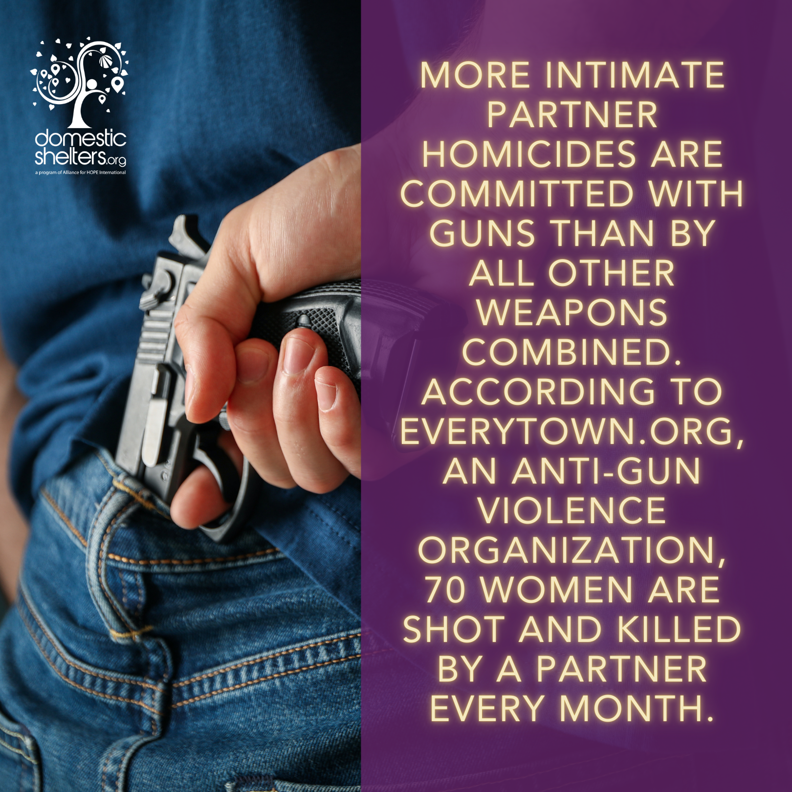 More intimate partner homicides are committed with guns than by all other weapons combined. According to Everytown.org, an anti-gun violence organization, 70 women are shot and killed by a partner every month, and 4.5 million women in the United States have been threatened by an intimate partner with a gun. Additionally, a domestic violence survivor is five times more likely to be killed by an abuser when there’s access to a firearm.