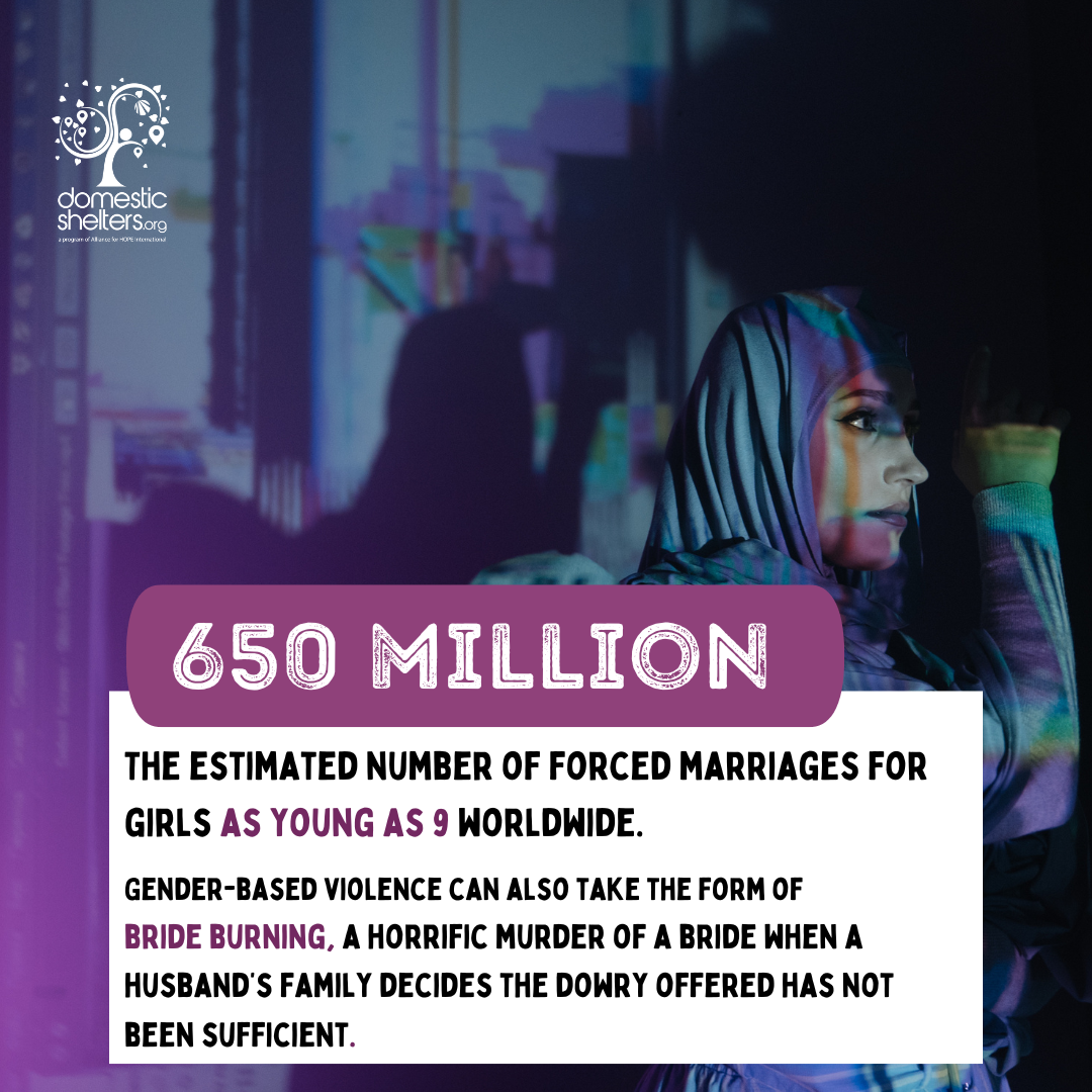 Globally, gender-based violence takes on many forms, including more than 650 million forced marriages for girls as young as nine; bride burning, a horrific murder of a bride after the husband’s family decides the dowry offered has not been sufficient; and dowry deaths, the suicides of more than 8,000 Indian women yearly stemming from the stress of her family not being able to pay a certain amount to her groom’s family, possibly to escape the more gruesome consequence previously described.