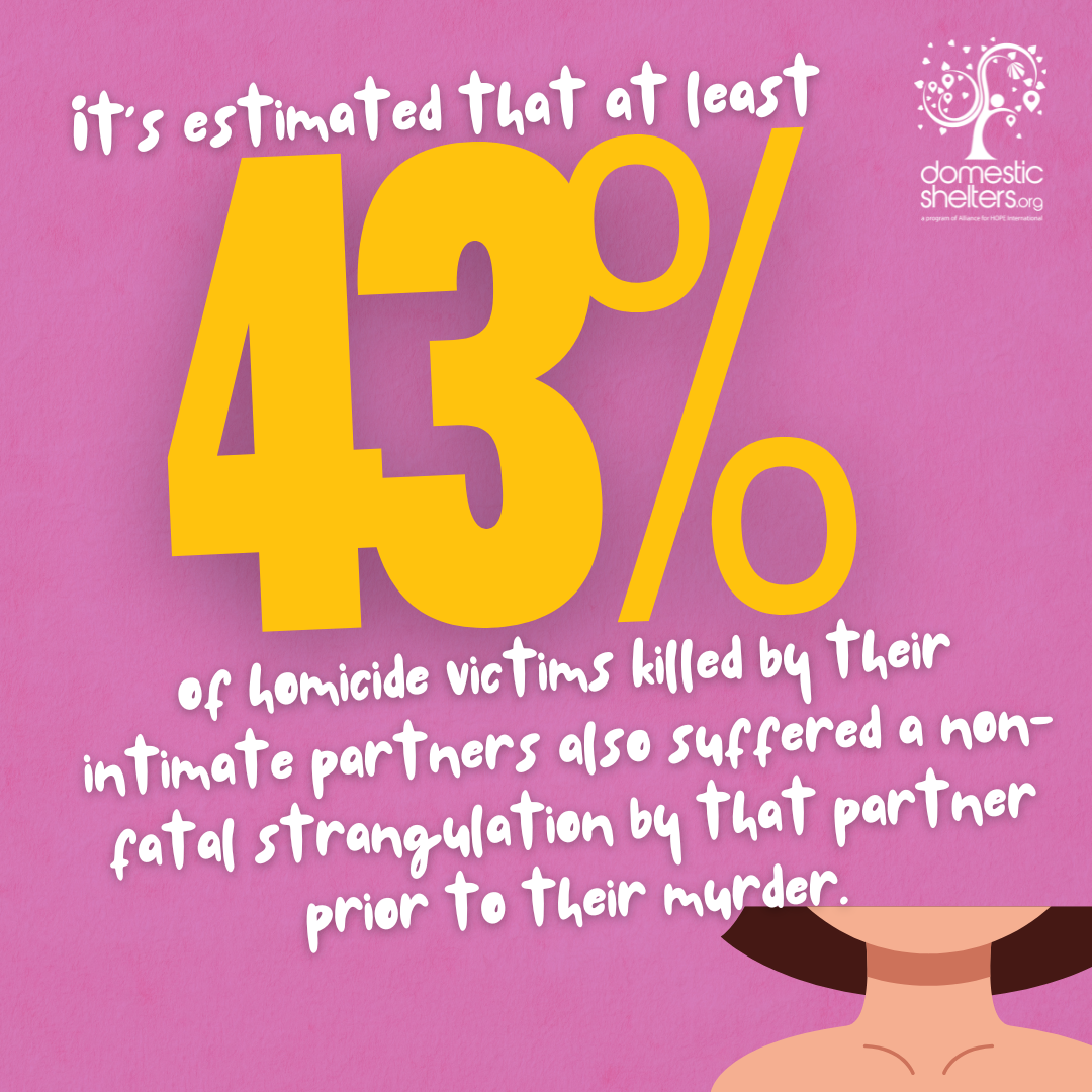 Not to mention, strangulation is also the most prominent predictor of homicide. Strangulation is a tactic of perpetrators who want to show that they can kill if they want to. In a study of homicide victims killed by an intimate partner, it was found that 43 percent had suffered a non-fatal strangulation prior to their murder.