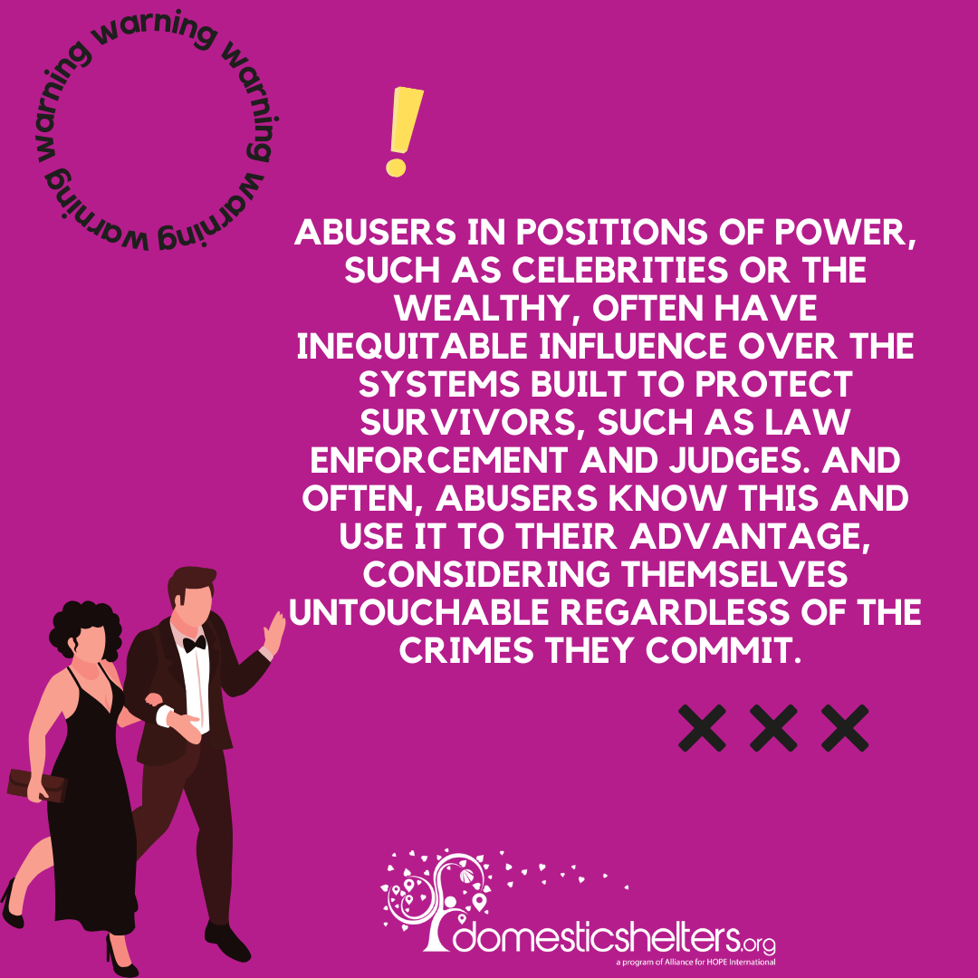 Abusers in positions of power, such as celebrities or the wealthy, often have inequitable influence over the systems built to protect survivors, such as law enforcement and judges. And often, abusers know this and use it to their advantage, considering themselves untouchable regardless of the crimes they commit.