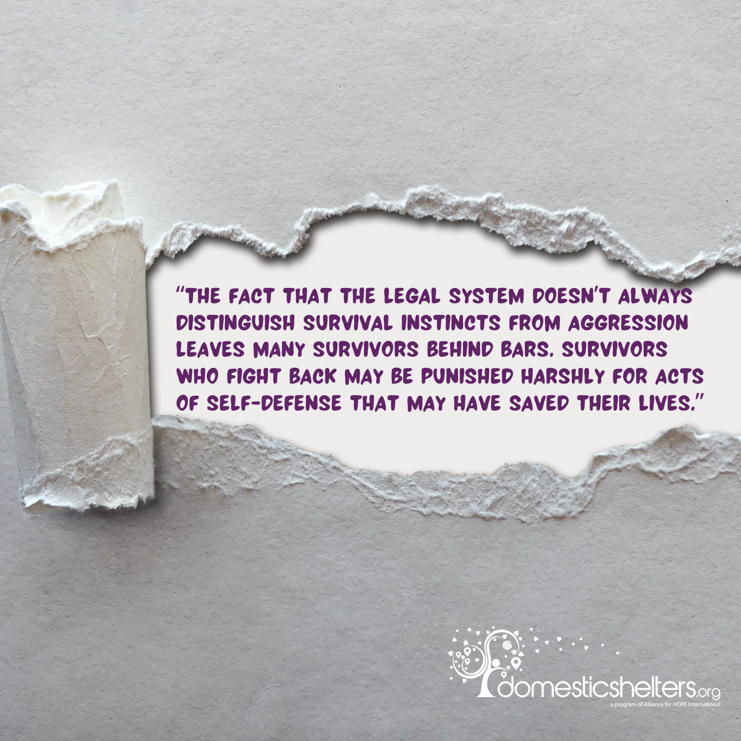 To make matters worse, the fact that the legal system doesn’t always distinguish survival instincts from aggression leaves many survivors behind bars. Survivors who fight back may be punished harshly for acts of self-defense that may have saved their lives.