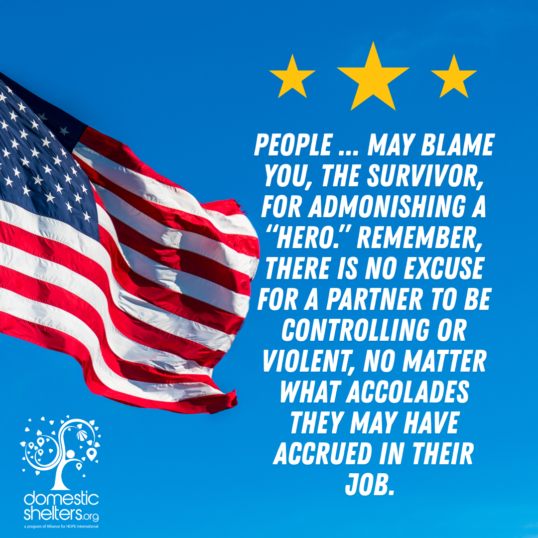 “Servicemembers will tell their spouse, ‘You’re going to ruin my career’ to convince you to drop it,” says Burke, regarding claims of domestic violence. Other people related to the abuser, such as fellow servicemembers, family members and even those inside the criminal justice system, may blame you, the survivor, for admonishing a “hero.” Remember, there is no excuse for a partner to be controlling or violent, no matter what sort of accolades they may have accrued in their job. You deserve to be safe. Find a support system that can remind you of that.