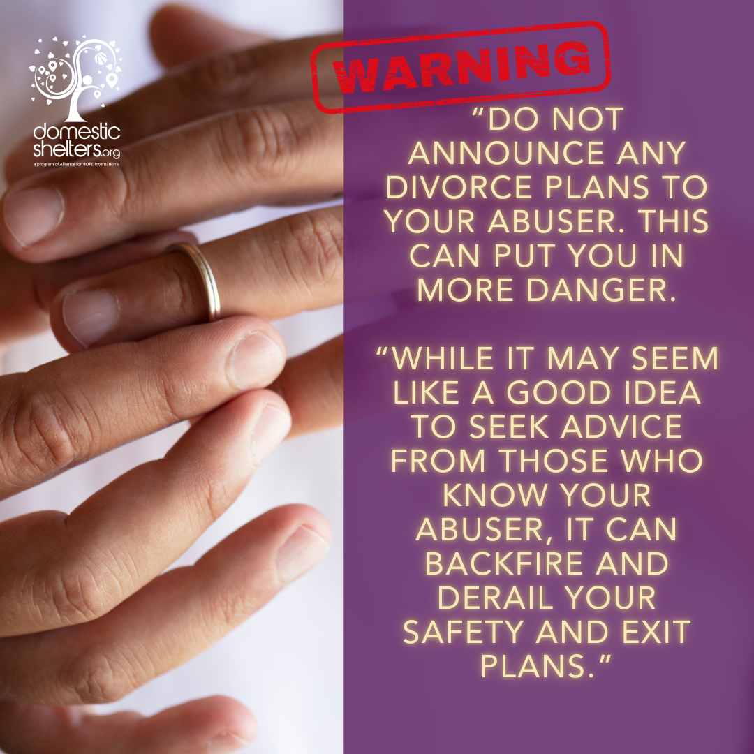 - Do not announce any divorce plans to your abuser. This can put you in more danger, warns Burke. And while it may seem like a good idea to seek advice from those who know your abuser, it can backfire and derail your safety and exit plans.” If you do attempt to talk about separation and divorce with his friends, mutual friends or his family, they are likely to side with the abuser,” says Burke.