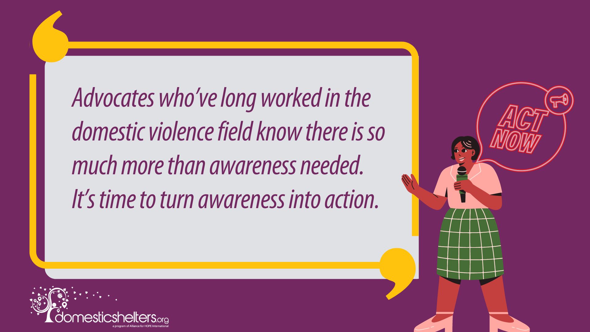 So, now that you’re aware of this very real problem, you may be wondering, is my job done here? Has domestic violence ended? Advocates who’ve long worked in the domestic violence field know there is so much more than awareness needed. It’s time to turn that awareness into action.