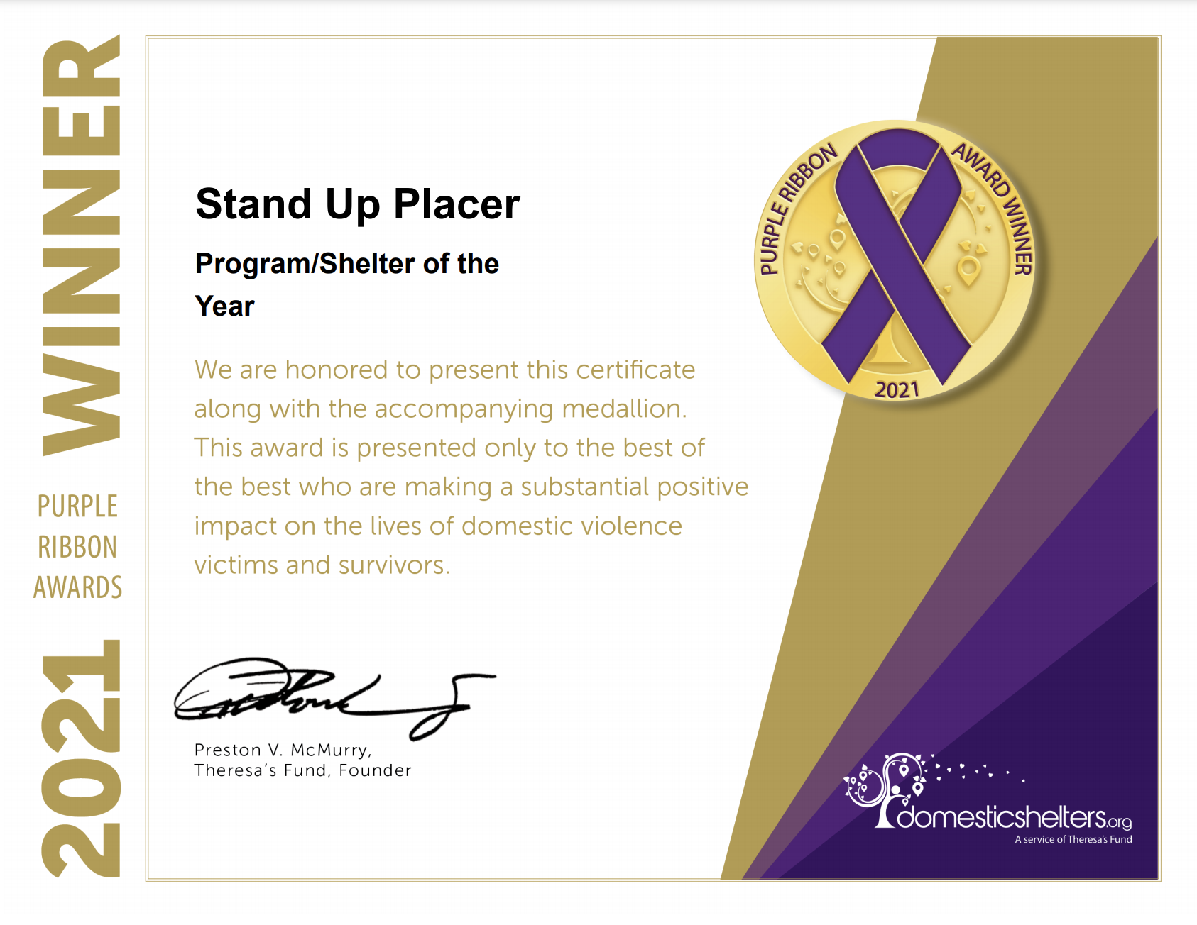 Winning entries were notified via email on July 16, 2021, along with a certificate signed by Theresa’s Fund founder Preston V. McMurry, Jr. that will be followed by receiving an official Purple Ribbon Award medallion that combines a purple ribbon and custom circular gold medal engraved with the winner’s category. All other entries have received an honoree certificate because everyone’s heroic efforts to help victims of domestic violence deserve acknowledgment and applause.