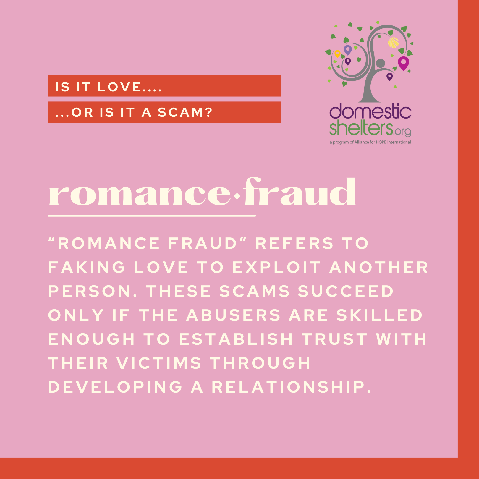 “Romance Fraud” refers to faking love to exploit another person. The term is most commonly used to refer to online schemes. But Romance Fraud exists in the real world, too. The key element is that an offender defrauds a target through what the target perceives to be a genuine romantic relationship. These scams succeed only if the abusers are skilled enough to establish trust with their victims through developing a relationship.