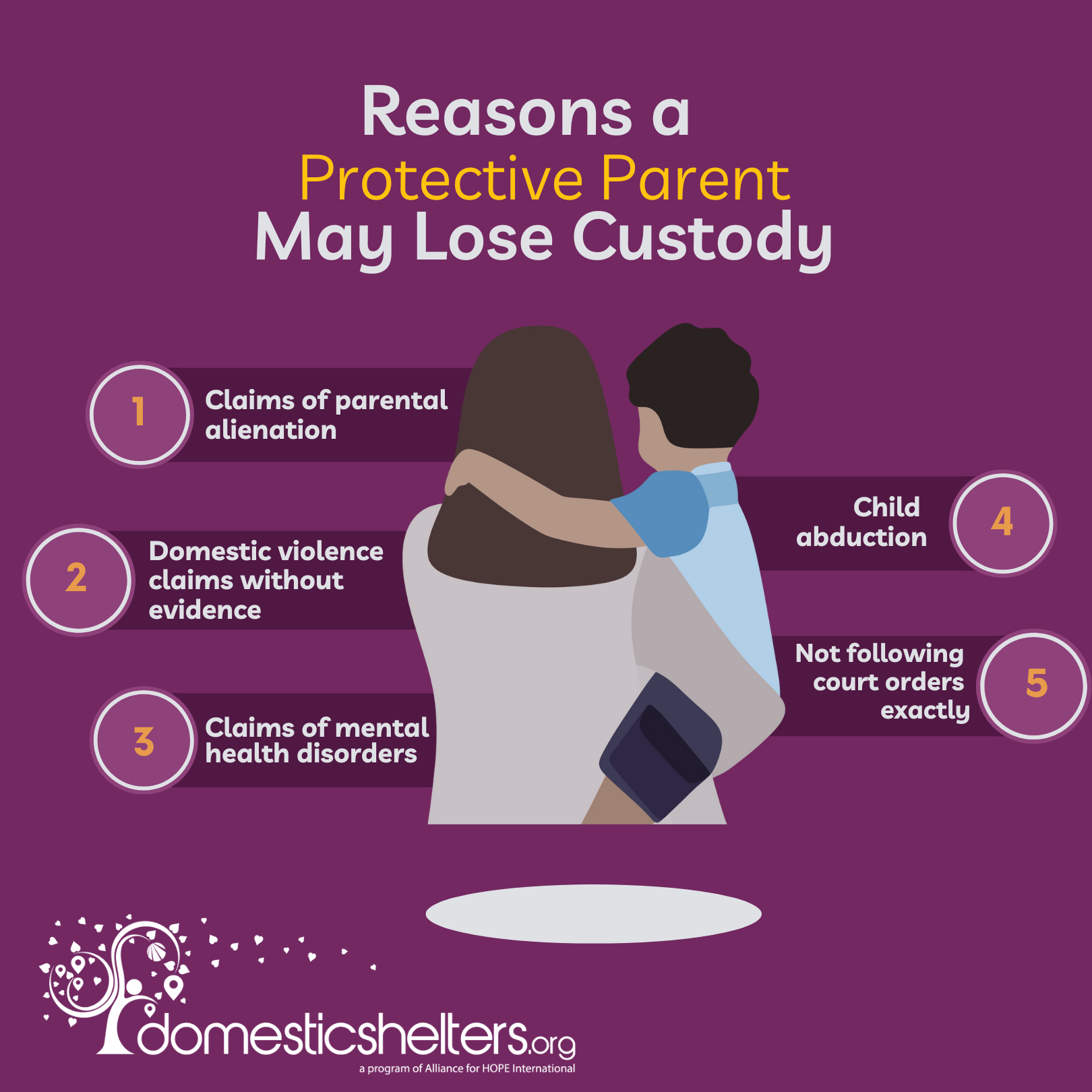 If there is a genuine and immediate threat to a survivor’s safety or the safety of their child, the protective parent should seek help from local law enforcement.