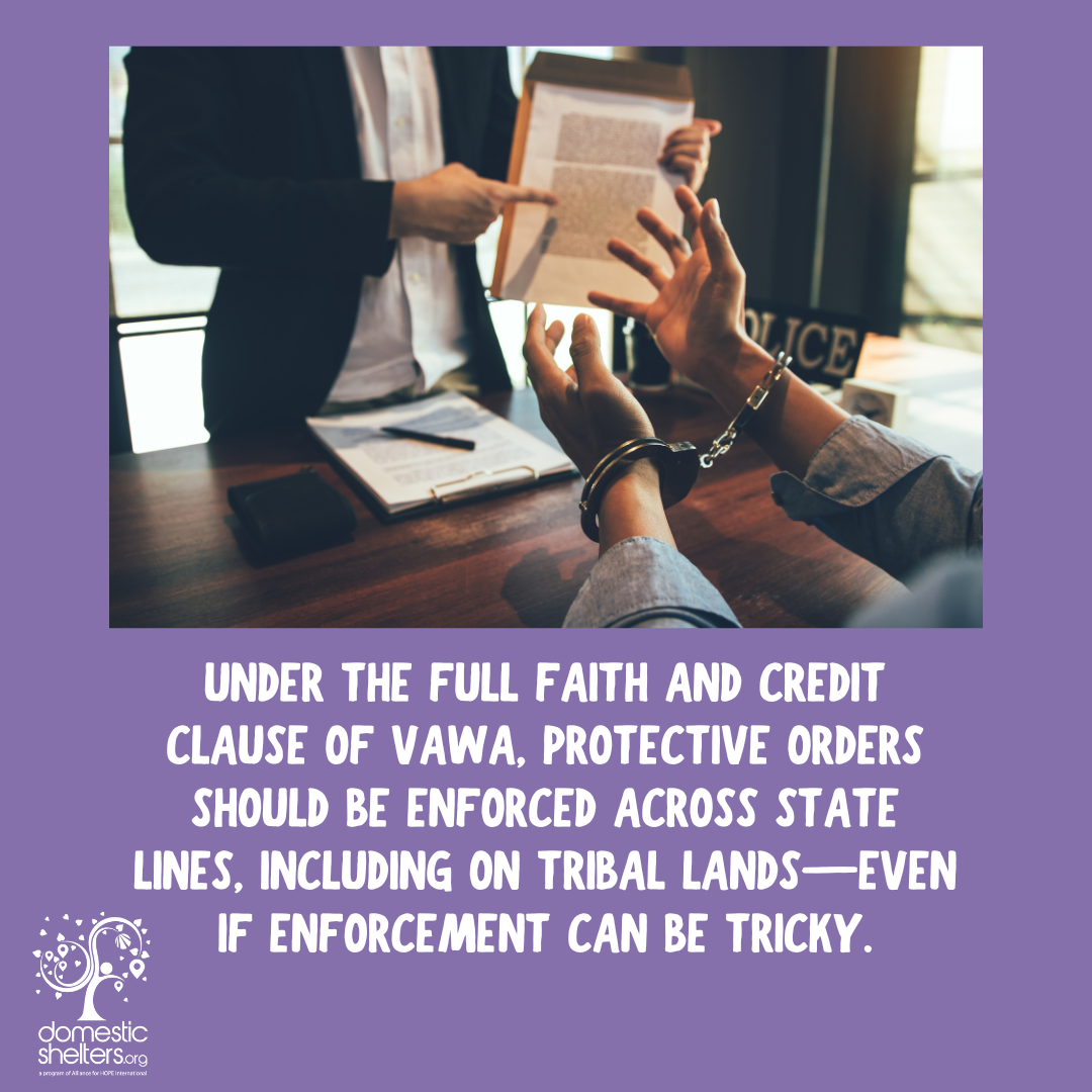 Under the Full Faith and Credit Clause of VAWA, protective orders should be enforced across state lines, including on tribal lands—even if enforcement can be tricky. For more information on this, read “Protecting Protective Orders.” And read our Guide to Restraining Orders to learn more about protective orders, also called restraining orders or orders of protection.